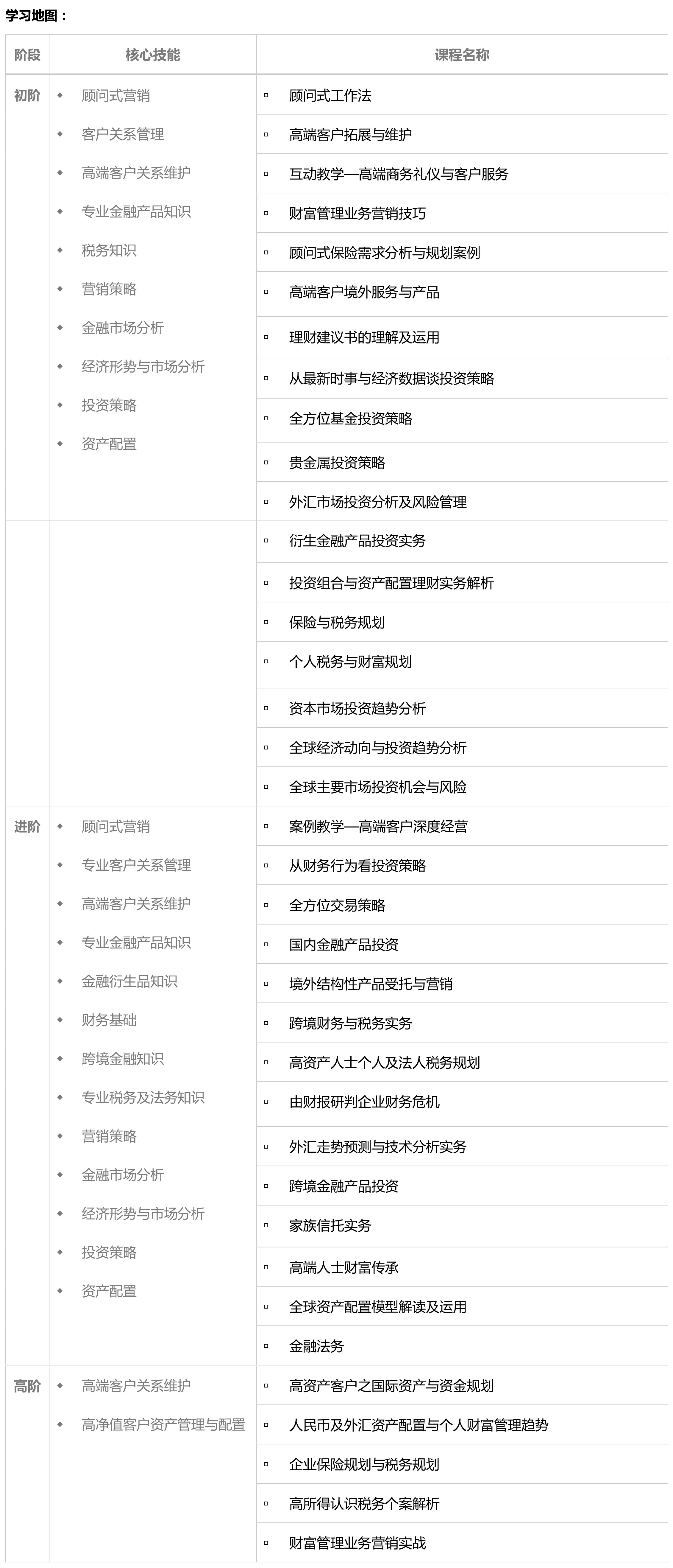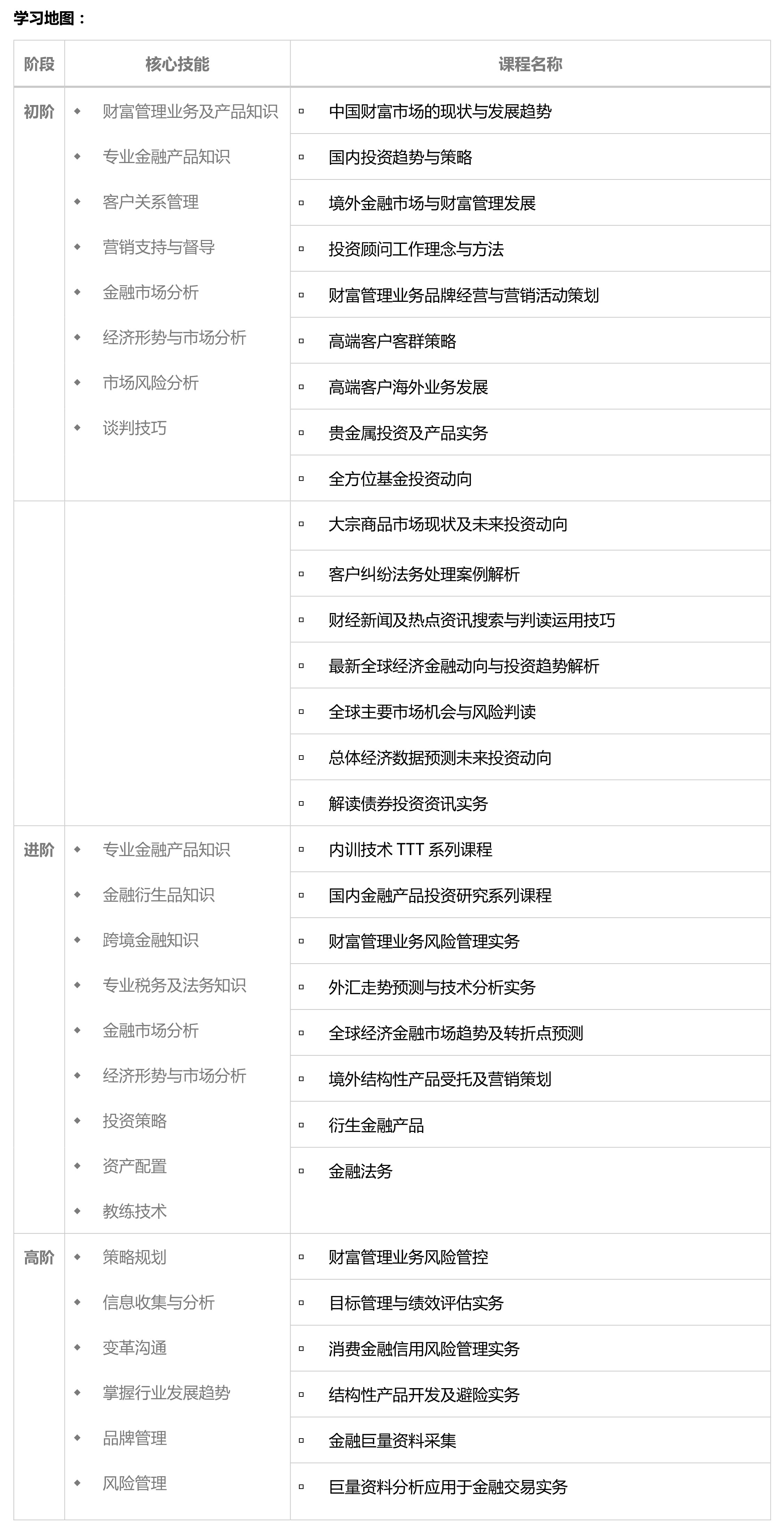 相关岗位:总分行财富管理部/私人银行部产品经理、营销支持岗、业务支持岗;总行投资顾问等