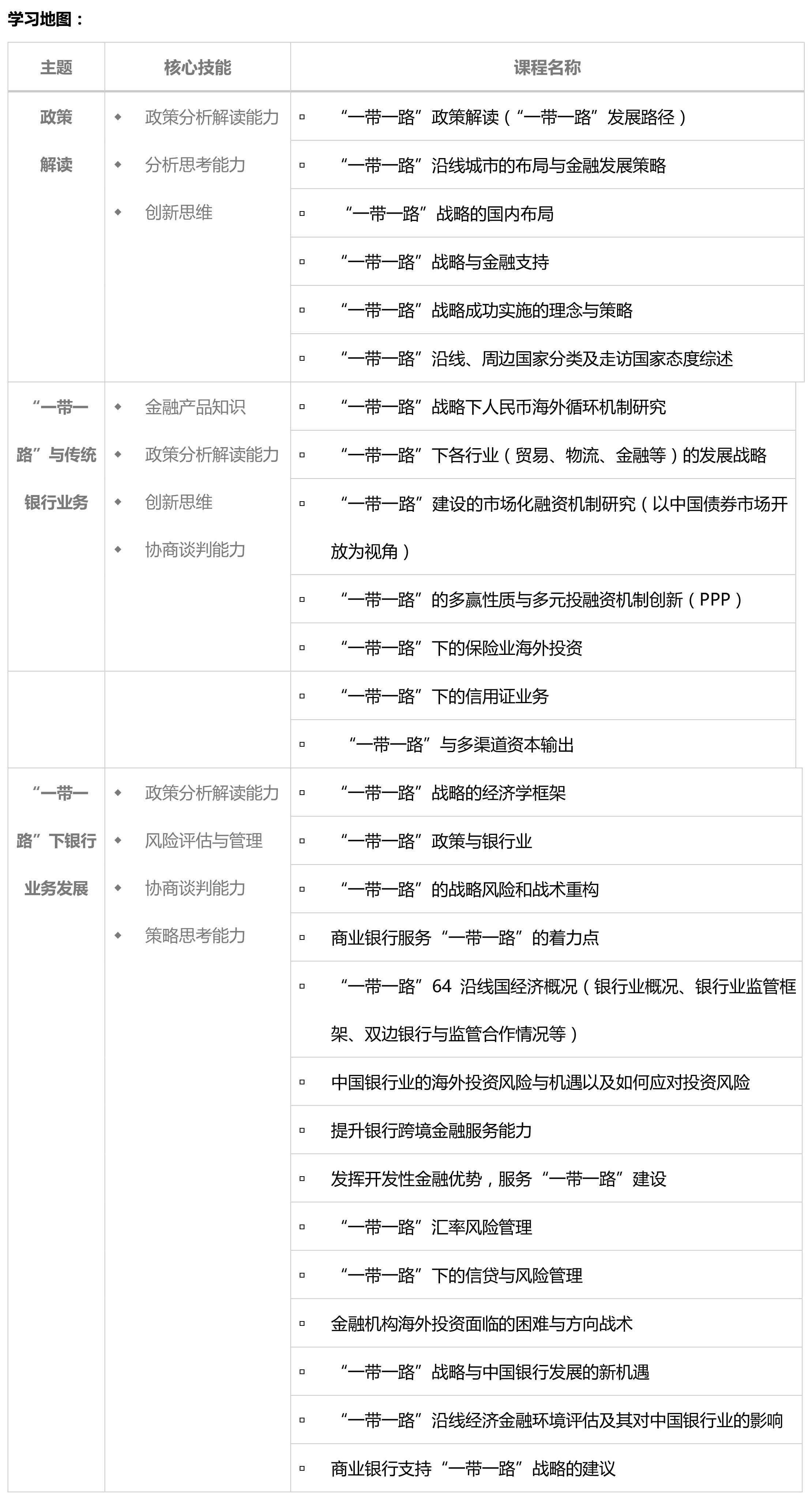 相关岗位:包括但不限于企业中高管、国际金融从业者、“一带一路”金融产品涉及人员、风险经理等。