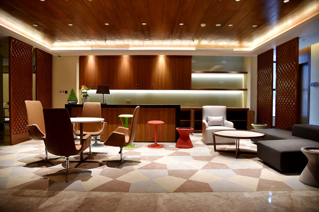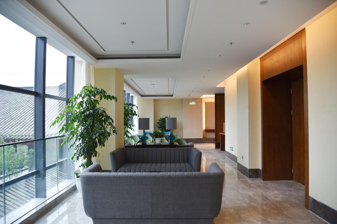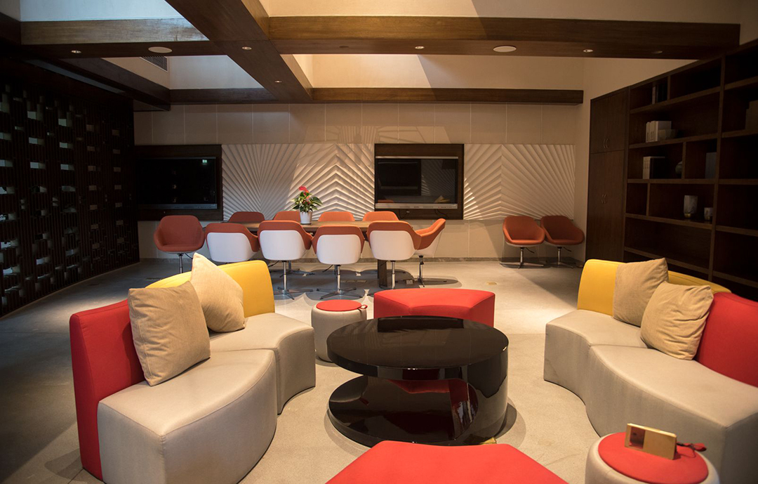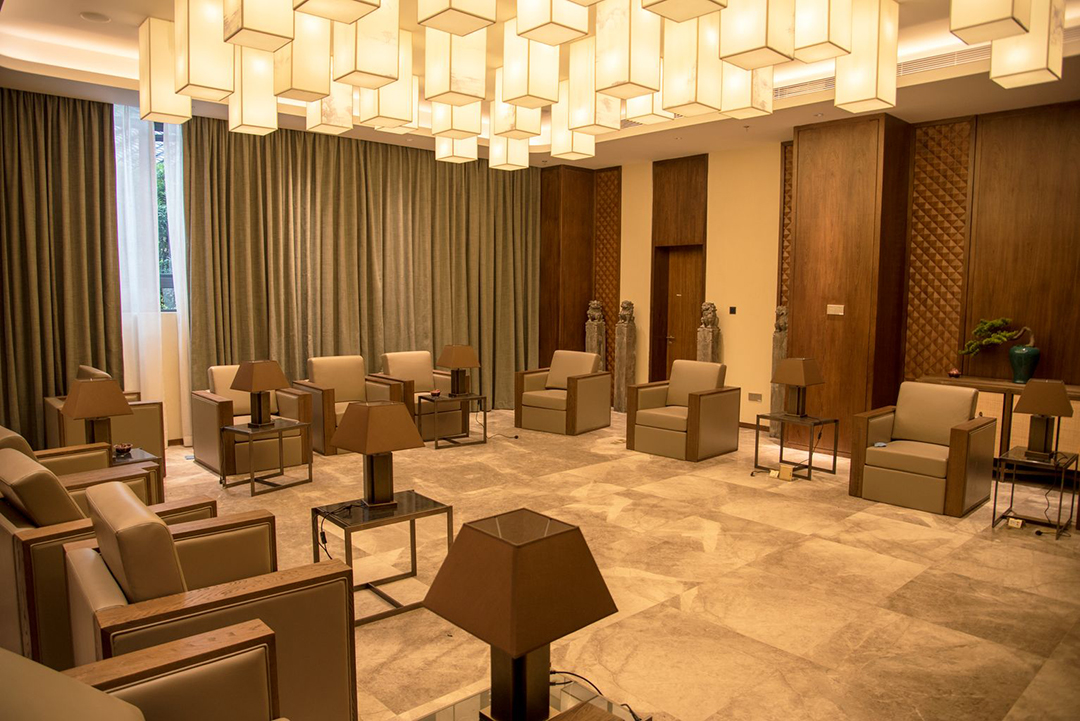 高管交流中心面积120平米,设有秘书室、茶歇区、研讨室(同声传译),适用于VIP接待、中式会谈。
