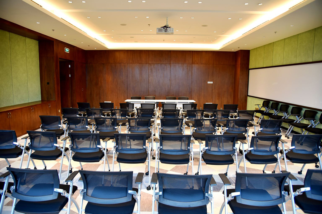 所有培训教室支持互联互通、中央监控,能提供直播与转播,提供场景式控制(灯光、窗帘、声音等一键切换),信号屏蔽系统、同声传译系统、翻转课堂系统、电子白板(无线投屏),并有衣帽存储、磁性墙面、升降讲台等人性化服务设施。