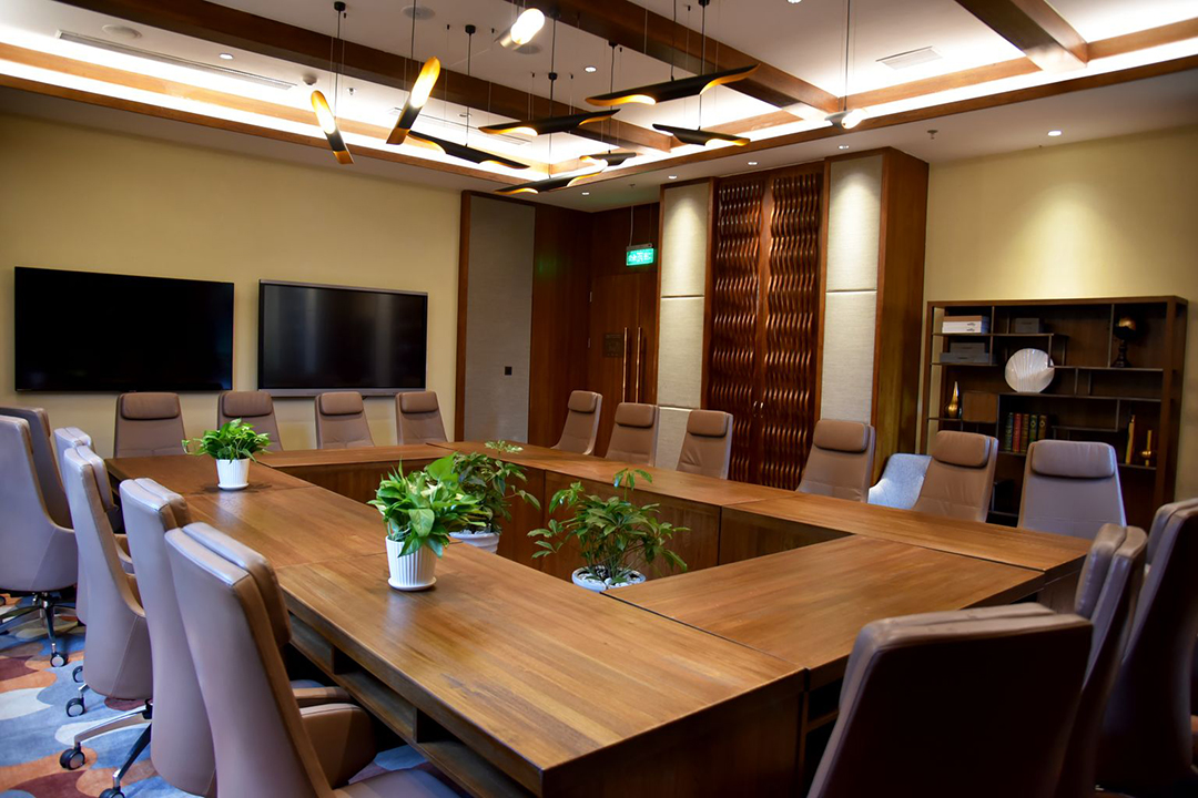 商务会议室面积45平米,配备有触摸式会议一体机、会议平板,适用于董事会会议、高管授课、远程视频。